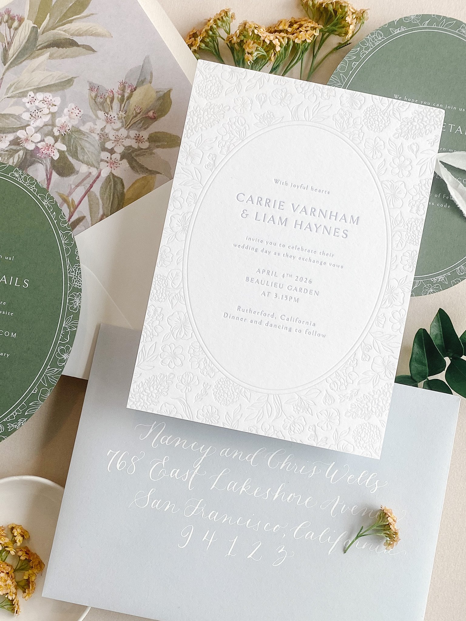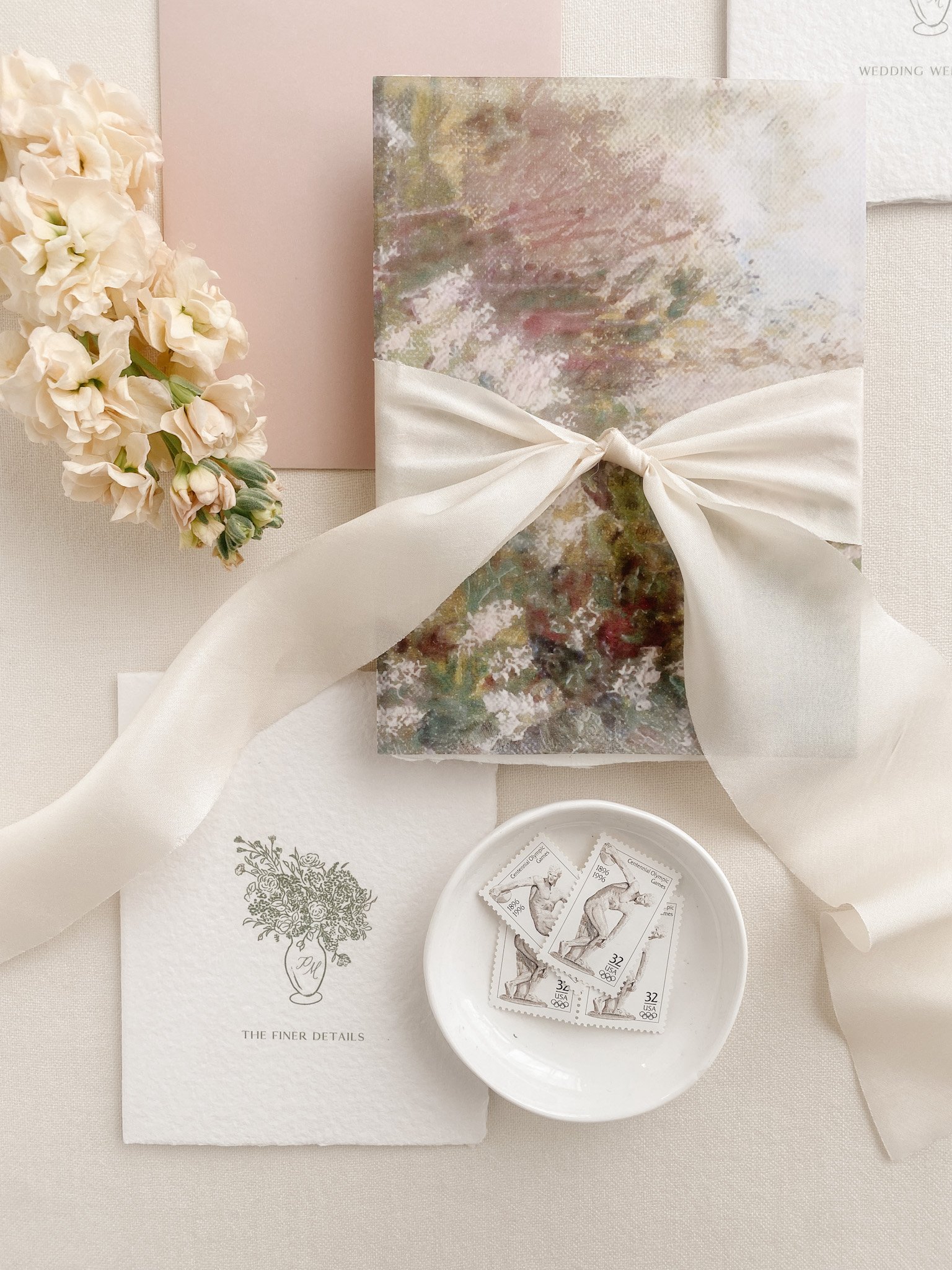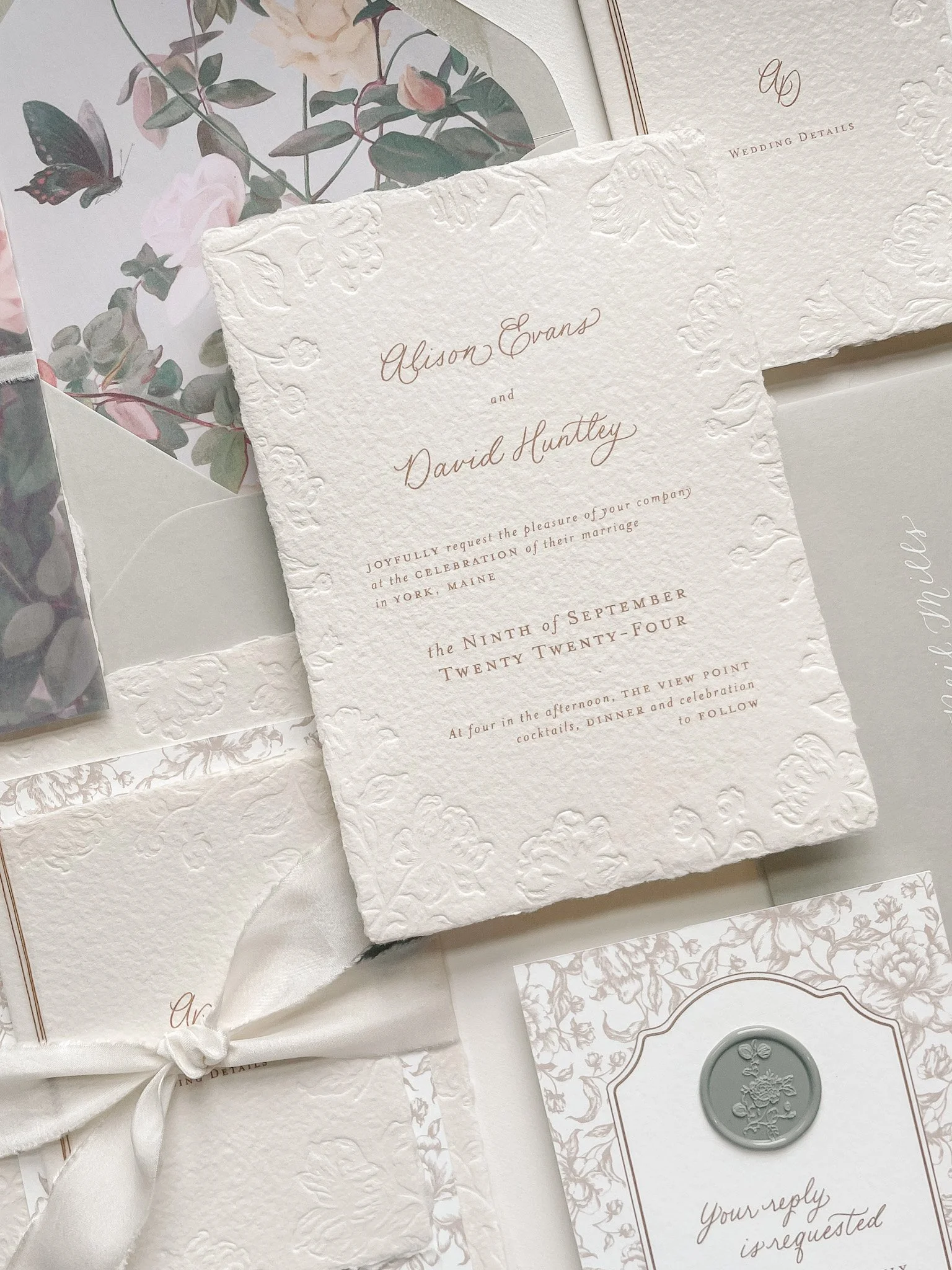 Production & Materials: A separate pricing schedule is prepared based on your choice of heirloom papers and high quality embellishments. Clients typically invest $4,000–$6,000 with speciality print finishes and embellishments.